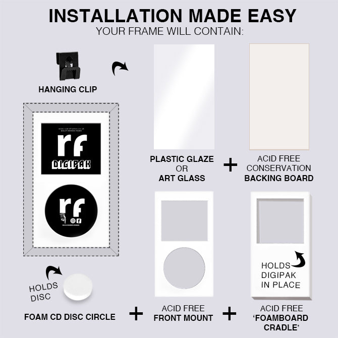 The cover is securely held in an internal acid-free Foam board Cradle. The disc is neatly held in place with a foam circle for a clean, professional finish—no glue, no tape, no mess.